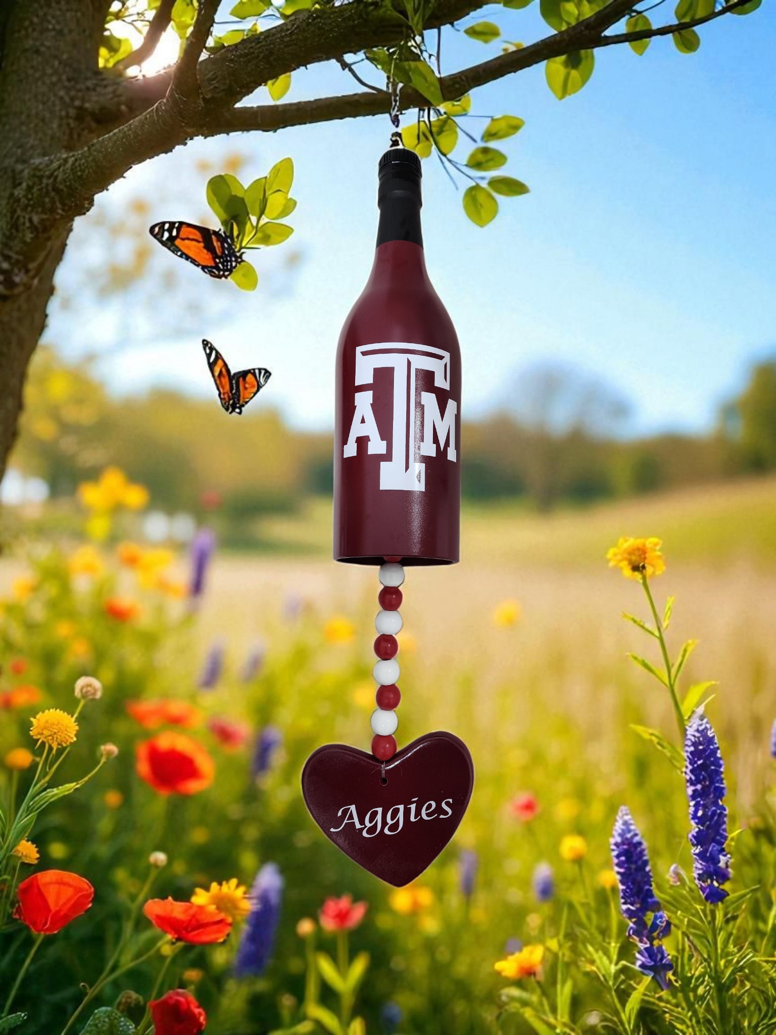 Add a touch of charm and whoop-worthy pride to your porch, garden, or patio with this eco-friendly wind chime made from genuine reclaimed wine bottles and proudly featuring Texas A&M colors and spirit.